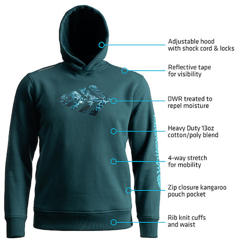 External features are headlined by a zip closure kangaroo pouch – keep open for quick hand warming and zip shut to securely store your keys, wallet, or smartphone. Rib knit construction at the cuffs and waist yields a secure fit while preventing drafts and heat loss. And reflective tape at the front and back of the shoulders promotes angler visibility in foggy, low-light, and nighttime conditions. Lastly, an adjustable hood shock cord locks to customize fit, with or without a hat.