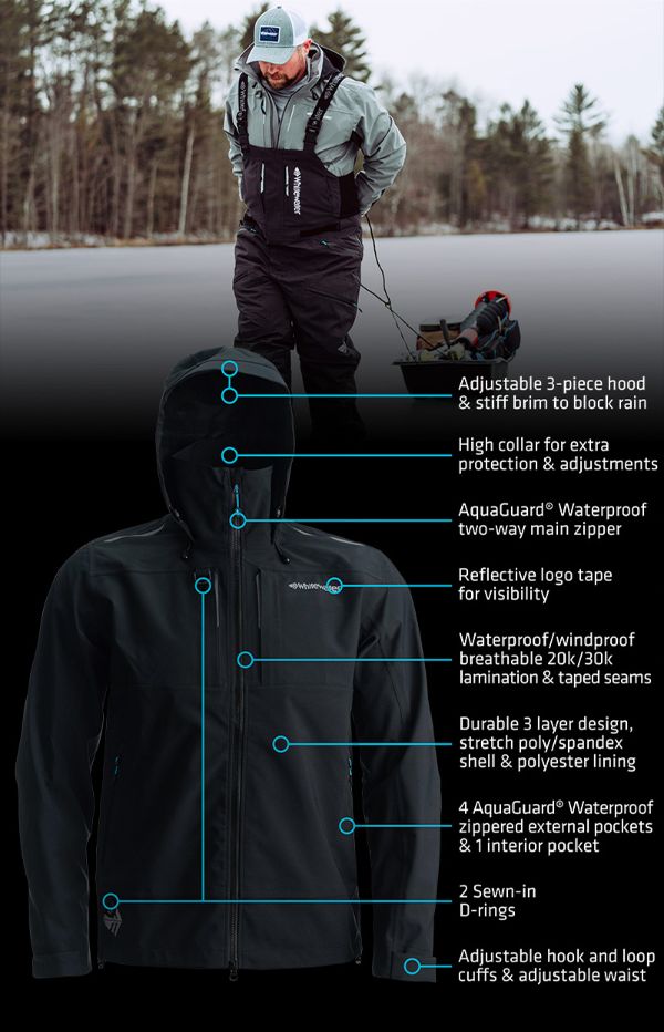 Consider, for example, Whitewater's Great Lakes Pro Jacket and Bib. The dynamic duo is already recognized as some of the best extreme weather raingear on the market, and properly layered for warmth – Beacon Technical Hoodie, Torque Heated Vest, and merino wool baselayer, for example – those inherent waterproof, windproof, and durability attributes equally apply to the hardwater.