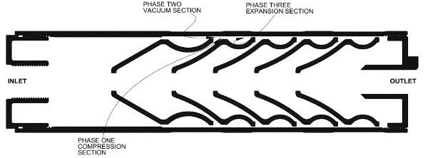 At the heart of the design are 3 main phases: Phase one of Vacuum Expansion (VE) Technology compresses the gases in the compression section. In Phase two the compressed gases accelerate through the transition area causing a low pressure zone distal to the previous expansion section. The creation of this low pressure causes a vacuum to pull gases from the previous expansion section (nearly eliminating gas blowback). In Phase three the gases accumulate in the expansion chamber causing a time delay (in microseconds) giving the bullet time to pass into the next baffle segment and repeating the cycle. A precisely machined internal volume that manipulates pressure differentials inside the suppressor body dynamically changes depending on the pressure of the round. Instead of allowing high‑velocity gases to pulse directly toward the shooter or expand laterally through ports, the system directs and controls the flow of gases. This technique not only reduces muzzle signature but also stabilizes recoil impulse, producing cleaner cycling and enhanced shooter comfort.