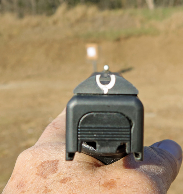 For zero-check, I shot at fifteen yards, two-hands unsupported on a circle target. Covering the three-inch center circle with the front “ball” sight, I shot five rounds. The 1 ¾ ” group was two inches above the aiming point and “GLOCK-left” by 1 ½”. At seven yards on the same target, I printed ½” high.