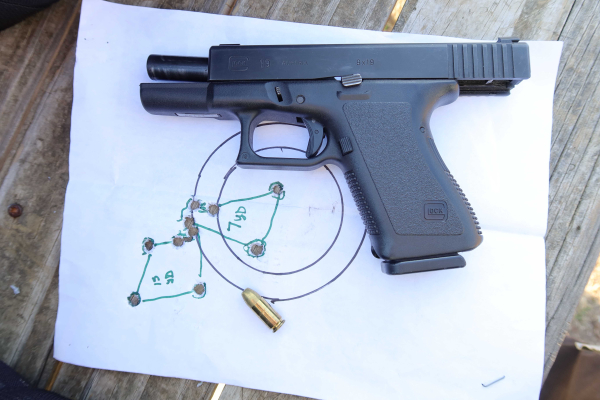The elderly G19 with old stock Cor-Bon 147gr Performance Match ammo used for the exercise. Below, the 15-yard zero check group is to the left, with the 7-yard group on the right. As one is close to the target, the aim/impact tends to converge.