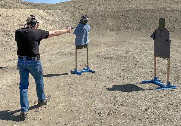 I stapled up a business-size envelope and shot it two-handed from 20 yards with the steel Kit Gun. That gave me a 3 3/8” group (more like it), with three hits into 2 ¼”.