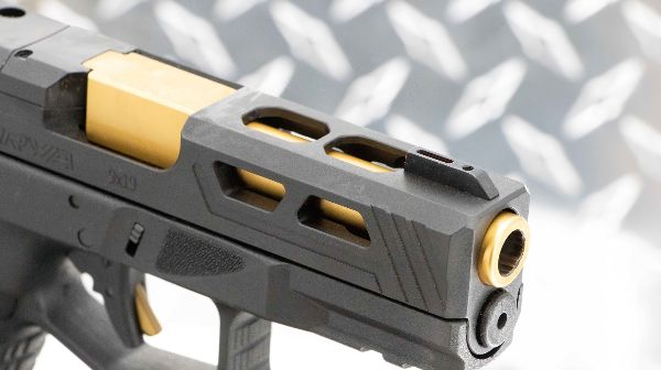 The DY9 Gold takes the original frame and trigger and adds upgrades with an optics-ready slide, GLOCK-pattern sights, mass reduction of the slide, and, of course the gold-colored PVD coating that gives this model its name. I’ve noticed some on the internet mock “speed holes” on pistol slides. I completely understand that those who get into grappling matches in grain silos while carrying with a race holster fear that foreign objects might wiggle into the slide and interfere with operation, but when I see metal lightening cuts I think of something else: physics.