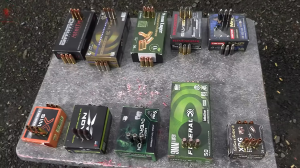 45gr Sim-X DEFENSECORE 65gr NovX Crosstrainer 72gr Liberty Ammunition Overwatch 100gr Federal BallistiClean 100gr Sellier & Bellot XRG 108gr Norma MHP 115gr TMJ EcoBullet 115gr Wincherster SilverTip 124gr Federal Premium HST 147gr Winchester Defense 165gr AMMO, Inc. /stelth/ Standard Range amunition was 124gr PMC FMJ