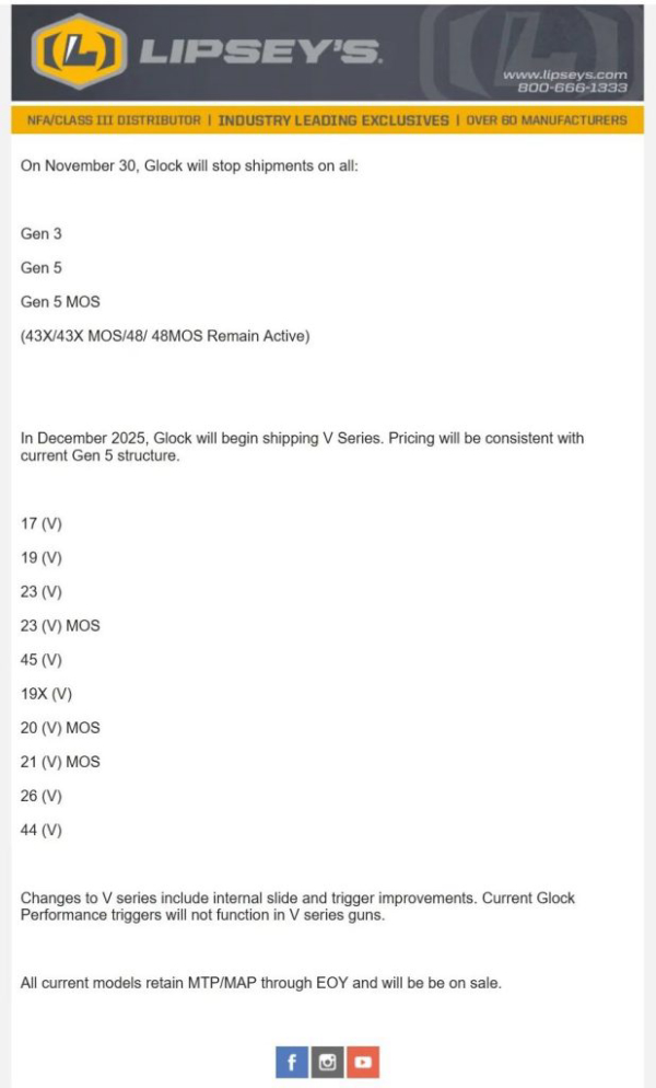 In December GLOCK will begin shipping a series of new models with “V” designations after the model numbers. The new V models will have rear plates and redesigned trigger bars that will prevent the use of full-auto switches. There will be new models in 22, 9mm, 40 S&W, 10mm, and 45 ACP. Firearm distributor Lipsey’s sent this notice to their customers with the new model numbers of the guns GLOCK will continue to produce.