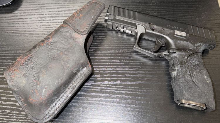 FALCO® Holsters has extended assistance to a customer Brett G. following a severe vehicle fire caused by a gasoline explosion. Despite the incident destroying the customer’s truck and leading to an extended hospitalization, the handgun carried inside the vehicle remained remarkably intact — protected by its FALCO® holster.