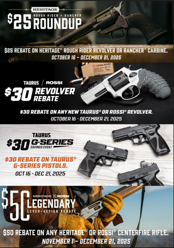 Time is running out to score the biggest savings of the season from Taurus®, Heritage® Manufacturing, and Rossi®. With less than 10 days remaining, customers can still take advantage of an exciting lineup of Q4 rebates—including cash-back offers, ammunition bonuses, and major savings across pistols, revolvers, lever-action rifles, and popular rimfire platforms.